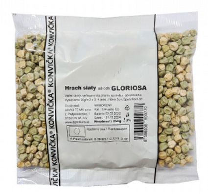 GLORIOSA – veľmi skorá odroda veľkozrnného hrachu záhradného, rastliny dorastajú do výšky asi 55 – 60 cm, lodyha je silná, pevná, list svetlo zelený. Lusk je rovný, dlhý 7 cm, tupo ukončený, obsahuje 6 – 7 zŕn. Zrno v technologickej zrelosti je veľké. V pestovaní nie je náročný na pôdu ani polohu. Dozrieva veľmi rýchlo a preto je vhodný postupný výsev. Poskytuje vysoké úrody kvalitného cukrového zrna, vhodného na priamy konzum i konzervárenské spracovnie.