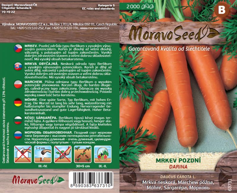 Neskorá mrkva DARINA typu Berlikum, má valcovitý koreň s dĺžkou 22cm, ktorý je odolný voči praskaniu. Táto vysoko výnosná odroda je taktiež odolná voči zozelenaniu koreňa a škvrnitosti listov. Okrem všetkých spomenutých výhod je veľmi dobre skladovateľná a obsahuje vysoký podiel betakaroténu. Keď mrkvu zasadíte hneď v marci, nebudete mať problém s vŕtavkou mrkvovou pretože tá vtedy svoje vajíčka nekladie.