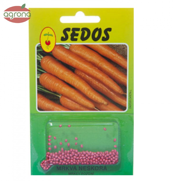 Obaľované osivo mrkvy neskorej, kalibrácia 2,5-3 mm. Je určené na pestovanie neskorej mrkvy z priameho výsevu. Umožňuje presný výsev ručný aj sejačkami, čím výrazne znižuje potrebu osiva a vylučuje jednotenie porastu.