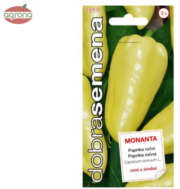 Balenie-farebné vrecko s obrázkom, 40s. osiva. MONANTA ─ veľmi skorá odroda vhodná na poľné pestovanie aj pre fóliové kryty. Plody sú hrubostenné, chutné, kónického tvaru a svetlo žltej farby. Uplatní sa na priamu konzumáciu i na konzervovanie.