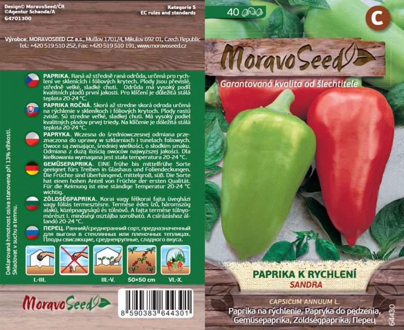 Paprika SANDRA tvorí sladké plody trojuholníkového tvaru, ktoré za úplnej zrelosti dosahujú hmotnosť 140g. Pestujeme ich výhradne vo fóliových krytoch alebo skleníkoch. Rastliny veľmi často vytvoria najprv jednu veľkú papriku, ktorú je však dobré odtrhnúť ešte zelenú, aby ste tak podporili rastlinu v tvorení ďalších plodov. Po dozretí majú papriky sýto červenú až rubínovú farbu.