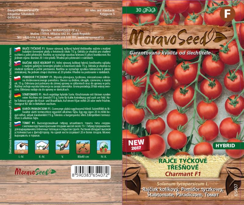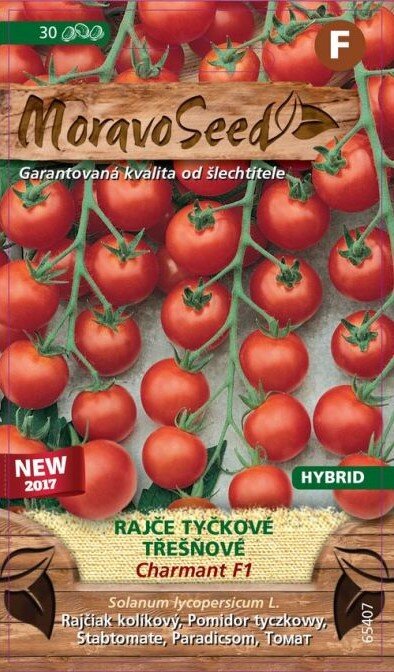 Plody kolíkovej paradajky čerešňového rajčiaku CHARMANT F1 sú sladké, nepraskajú, rovnomerne dozrievajú a z dlhých strapcov neopadávajú. Odroda je veľmi výnosná a vhodná na studené rýchlenie, poľné pestovanie alebo pestovanie v nádobách. Na jednom strapci dozrieva približne 20ks, 15 gramových plodov, ktoré sú vysoko odolné voči plesni zemiakovej.