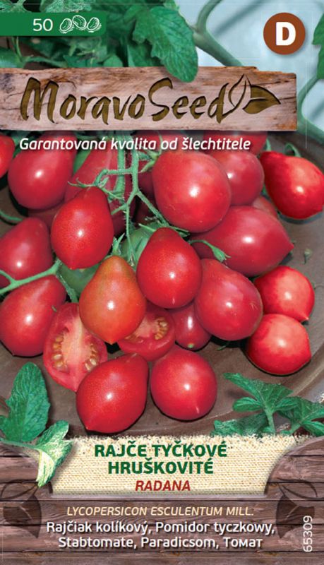 Hruškovité. Poloskorá odroda kolíkového rajčiaka s malými plodmi hruškovitého tvaru s hmotnosťou 15 – 20 g. V priebehu vegetácie postupne vylamujeme zálistky. Vegetačný vrchol zaštipujeme za 6. – 7. strapcom, čím urýchlime dozrievanie plodov.