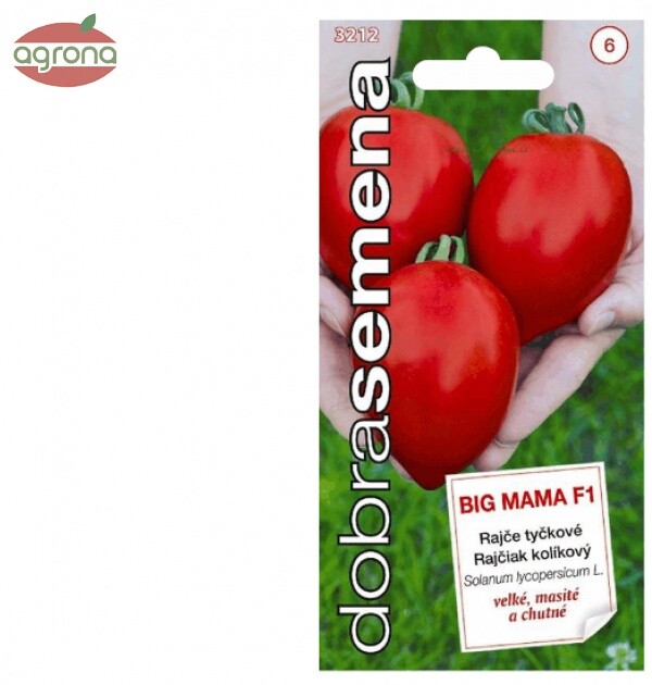 Balenie-farebné vrecko s obrázkom,10s. osiva. BIG MAMA F1 ─ kolíkový rajčiak s veľkými, mäsitými plodmi výbornej chuti. Vhodný na priamu konzumáciu i na spracovanie ─ na kečupy alebo omáčky. Plody dorastajú do hmotnosti až 250 g, sú rovnomerne vyfarbené, bez žltého prstenca pri stopke plodu.