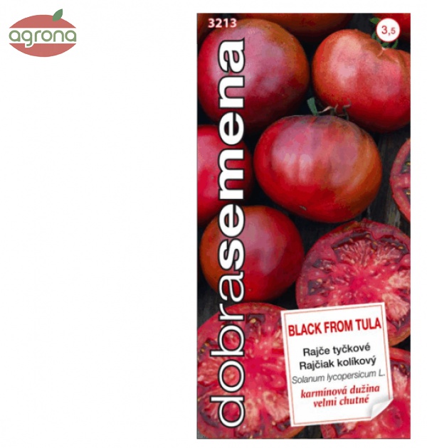 Balenie-farebné vrecko s obrázkom,30s. osiva. BLACK FROM TULA─ biftekový rajčiak s tmavohnedým, viackomorovým plodom. Dužina je intenzívne karmínovo zafarbená, šťavnatá, maslovej konzistencie. Stará odroda pôvodom z Ruska a Ukrajiny, ktorá sa dnes pestuje po celom svete. Je cenená hlavne pre svoju výbornú chuť.