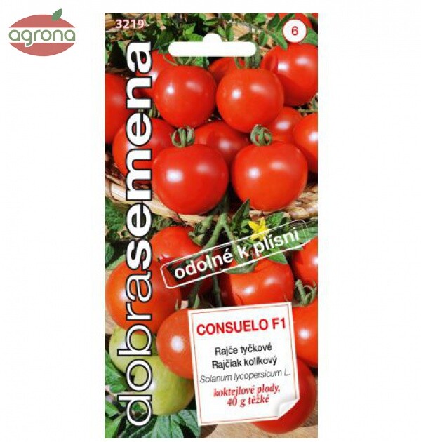 CONSUELO F1 10 S – Kolíkový rajčiak s vysokou odolnosťou voči plesni. Stredne veľké „koktejlové“ plody s hmotnosťou cca 40 g. Dozrievajú do jasno červenej farby. Bohaté a dlhé výhony nesú až 30 plodov. Rajčina, ktorá je veľkosťou, farbou aj chuťou najbližšie odrode BEJBINO. Chemickú ochranu môžete obmedziť na minimum a tým získať skutočne zdravé rajčiny.
