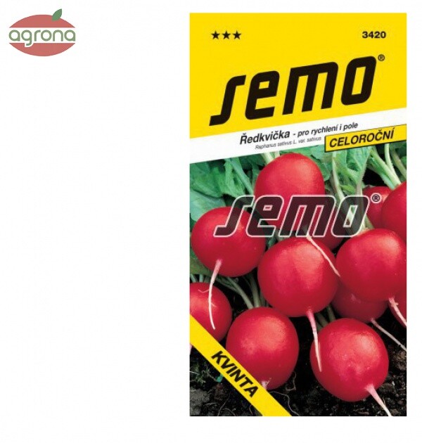 KVINTA – perspektívna skorá až poloskorá odroda reďkovky na skoré poľné pestovanie aj na jesenné výsevy od 15. augusta. Väčšia, guľatá buľvička so svietivo červenou farbou a jemnou šupkou ju robia veľmi atraktívnou. Dužina je biela, jemná, veľmi odolná k hubovateniu. List je polovzpriamený, mohutnejší, svetlo zelenej farby. Je veľmi odolná voči praskaniu a vybiehaniu do kvetu. Na jesenné siatie odporúčame riadky 10 – 12 cm, 300 – 350 semien /m2 .