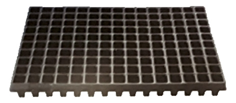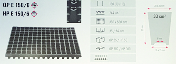 Plastový sadbovač HerkuPak: 150 buniek, horný rozmer 30x30mm, spodný rozmer 16x15mm, výška 60mm, objem 33cm3, hustota744 rastlín na m2, rozmer sadbovača 360x560mm.