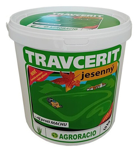 Travcerit jeseň (NPK 10-0-25%, Mg 2%,Fe 0,5% ) granulované jesenné hnojivo na trávnik. 10kg postačí na vyhnojenie 300m2 trávnika.