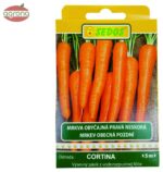 Mrkva obyčajná pravá neskorá Cortina F1, 5m, 250 semien. Neskorá odroda typu Flakkeese. Koreň je dlho valcovitý, oranžovo – červenej farby, hlava koreňa nezelená, je bez antokyanového sfarbenia a nedeformuje sa.Tvar špičky koreňa je tupo-špicatý. Vhodná pre mechanizovaný zber. Dĺžka koreňa 18-20 cm. Vegetačná doba od výsevu 150-160 dní. Pre výsev sa doporučuje medziriadková vzdialenosť 20-25 cm. Hĺbka sejby 1- 1,5 cm. Po výseve je potrebné udržiavať optimálnu vlhkosť pôdy 50-60%PVK (pôda je na dotyk vlhká, ale nie mokrá). Semeno klíči za 21-30 dní podľa teploty pôdy. Vhodné je prikrytie netkanou textíliou po výseve. Zvýši sa teplota pôdy. udržuje sa vyššia vlhkosť a netvorí sa škodlivý pôdny prísušok.