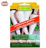 Petržlen koreňový + zn.plodina Hanácká + reď., 5m, 300+30 semien Neskorá odroda určená na skladovanie. Koreň kužeľovitý až kyjovitý, krémovobielej farby, dorastá do dĺžky 14-17 cm. Povrch je hladký. Odroda má dobrú odolnosť proti hrdzavosti a proti chorobám pri skladovaní. Vegetačná doba od výsevu je 180-200 dní. Vysievať čo najskôr na jar. Pre výsev sa doporučuje medziriadková vzdialenosť 30-35 cm. Hĺbka sejby 1- 1,5 cm. Po výseve je potrebné udržiavať optimálnu vlhkosť pôdy 50-60%PVK (pôda je na dotyk vlhká, ale nie mokrá). Semeno petržlenu klíči za 21-30 dní podľa teploty pôdy, semeno reďkovky 5-6 dní po výseve. Vhodné je prikrytie netkanou textíliou po výseve. Zvýši sa teplota pôdy. udržuje sa vyššia vlhkosť a netvorí sa škodlivý prísušok. Po 30-35 dňoch opatrne zozberáme reďkovku a petržlen ponecháme na poli až do konzumnej zrelosti.