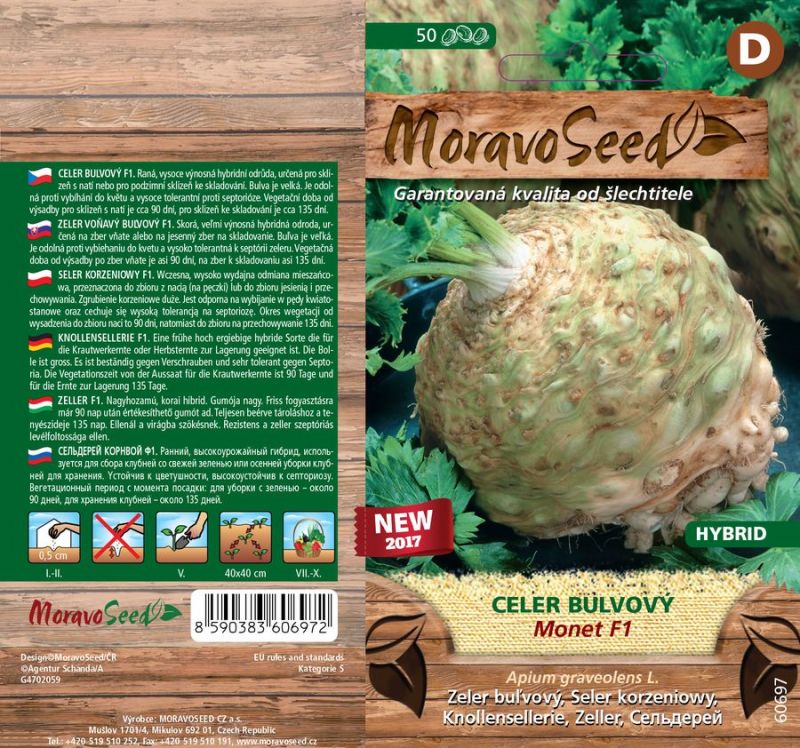Buľva zeleru MONET F1 je na povrchu hnedozelená, vnútri dužinatá, biela a krehká. Je odolná voči vybiehaniu do kvetu a taktiež voči septorióze zeleru (škvrnitosť listov). Listy tvoria mohutnú ružicu. Sú výrazne tmavozelené, hladké a lesklé. Zeler má veľmi vysoké nároky na teplo a svetlo. Pôda musí byť bohatá na živiny, humózna a dostatočne zavlažená. Listy zo zeleru buľvového nemusíte vyhadzovať. Použite ich napríklad ako korenie do polievky. Táto skorá odroda je určená na zber vňate alebo skladovanie z jesenného zberu. Vegetačná doba od výsadby po zber vňate je približne 90 dní. Vegetačná dobá na zber k skladovaniu trvá približne 135 dní.